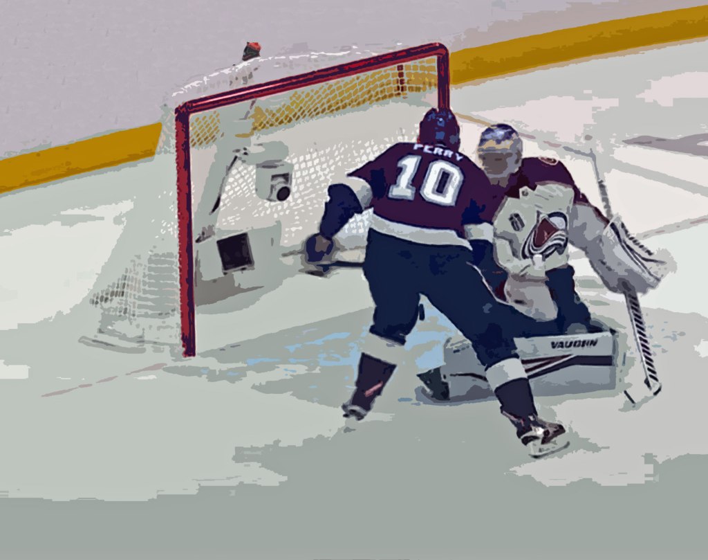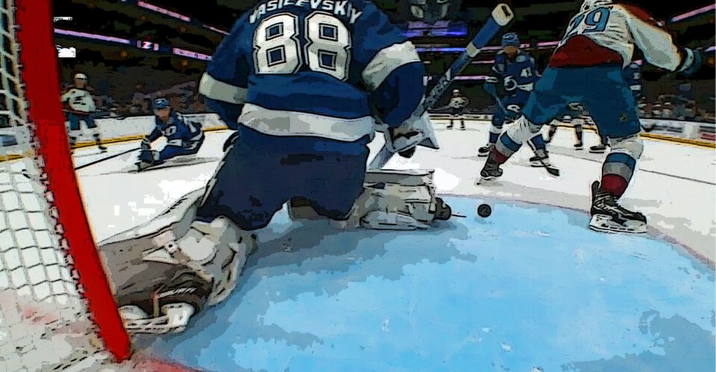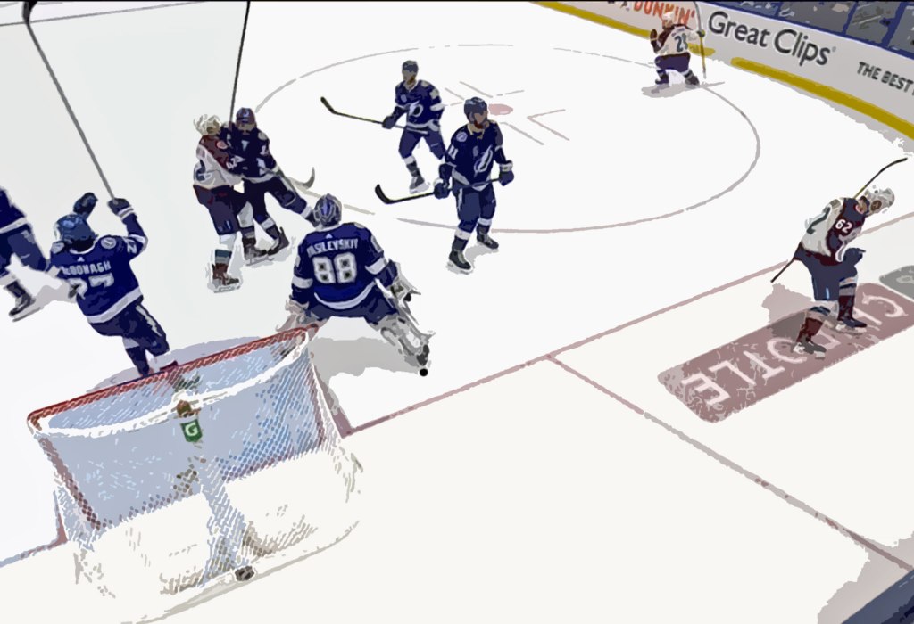 The second period starts quickly also as “The Mac Attack is Back” for the Burgundy and Blue with Mr. MacKinnon’s second of the Finals on his fourth shot which went off of Mr. Vasilevskiy’s blocker to tie the game and Mr. Kane for the playoffs goals (13) lead.