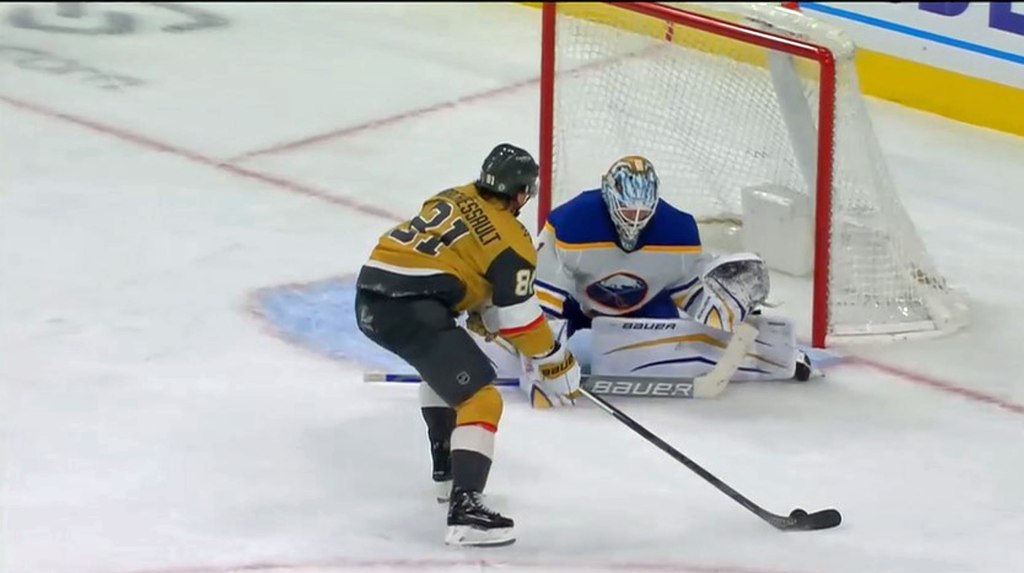 Mr. Luukkonen held on to the puck at the 4:11 mark and after the face off Buffalo iced the puck at 3:55 Commentator Mr. Ray remarked it was good icing and that the team just needs to be patient.