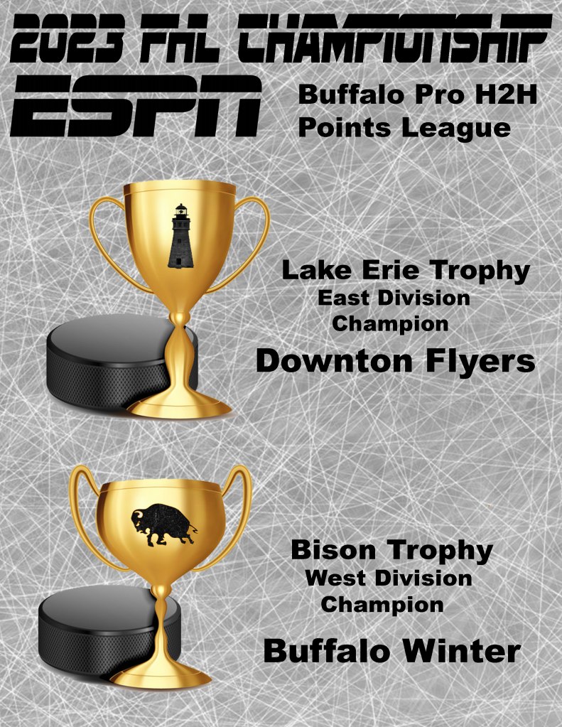 The Buffalo Pro H2H Points League FHL Championship begins tonight with anticipation of the League’s Leader from the East Division Downton Flyers continuing their domination and securing this season’s Championship.