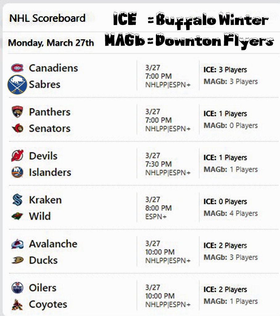 The NHL has six games scheduled tonight as ESPN FHL Finals begin the playoffs with a positive outlook for both combatants as each Division Champion advanced to the finals with comparable offensive statistics with Downton Flyers having the edge in goaltending.
