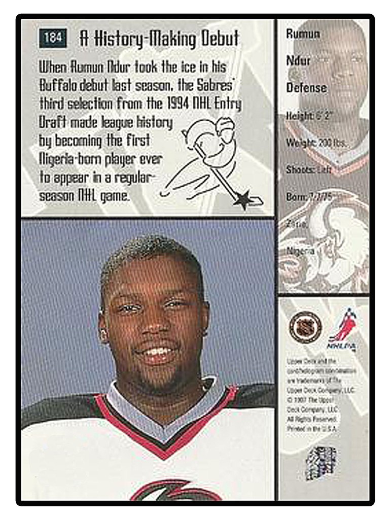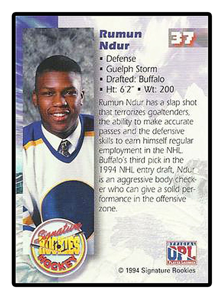 First African-born NHLer Mr. Ndur grew up in Ontario and like most Canadian boys began to skate, play Hockey, and dream of the NHL which occurred for him during the 1994 NHL Entry Draft when the Buffalo Sabres selected Mr. Ndur in the 3rd round 69th overall.