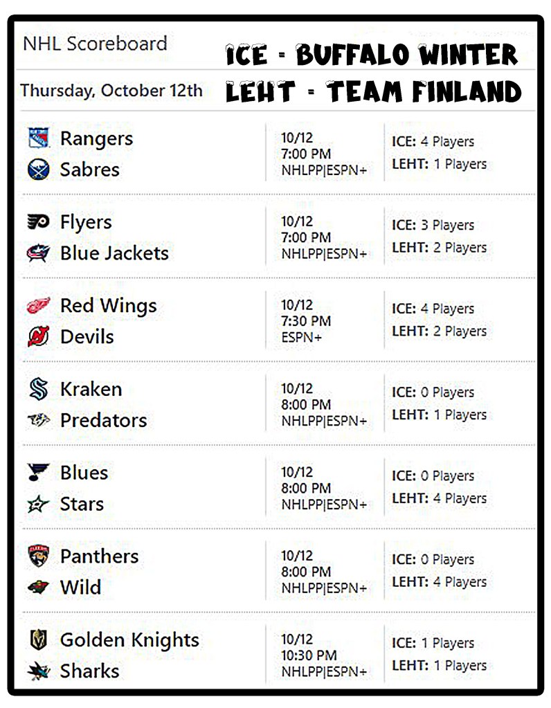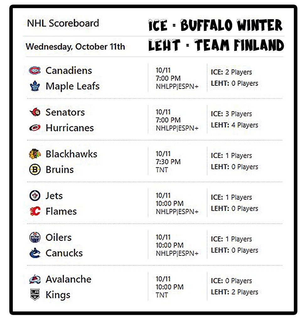 Last night Toronto had a brilliant come-from-behind, two empty-net goal game versus Montreal to eventually win in a shootout 6-5 in their home opener, meanwhile Vancouver annihilated Edmonton in an 8-1 effort.