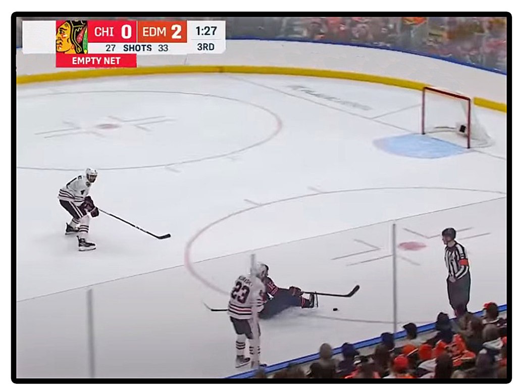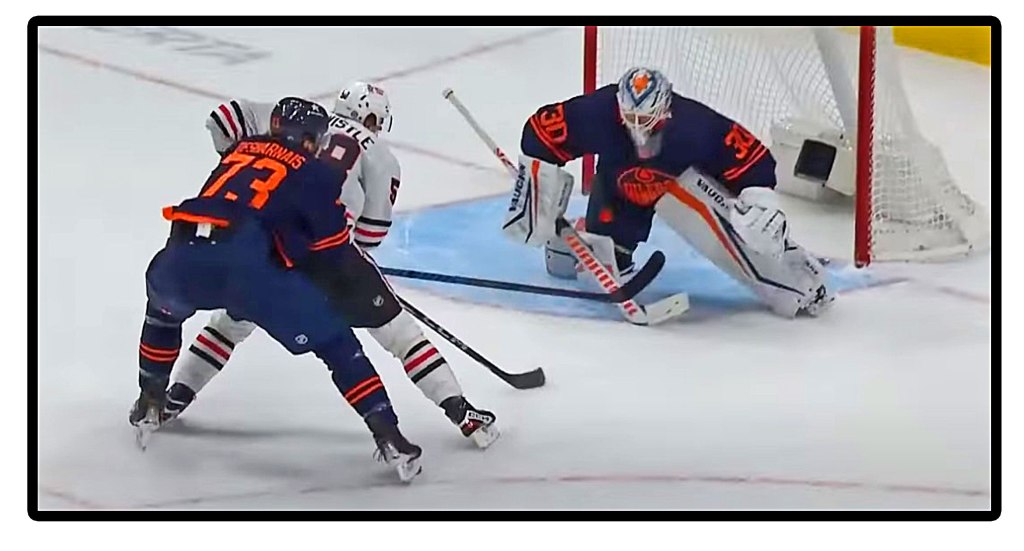 After Edmonton defenseman Mr. Desharnais blatantly mauled Chicago’s winger Mr. Entwistle on the way to the net the Blackhawks were awarded a penalty shot with 1:36 minutes remaining in the second period resulting in an excellent save by the Edmonton goaltender.