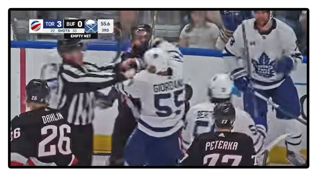 What goon giordano did is inexcusable, goon mcmann put Mr. Peterka in a headlock which caused Mr. Tuch to step in after dealing with goon giordano, even Toronto’s 60 goal scorer had to goon it up as well by twice attempting to headlock Mr. Thompson.