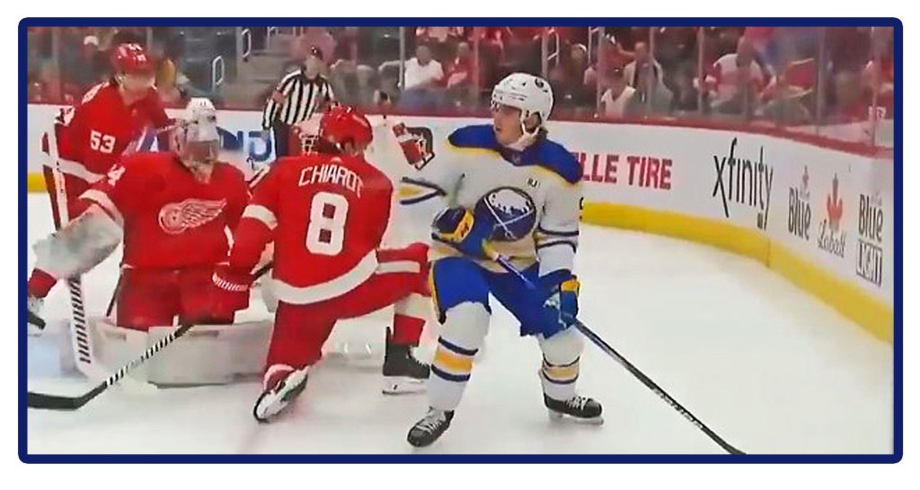 The Sabres outstanding 18 years old Left Wing Zach Benson continues to impress, last night on the power play he took possession of the puck from two Detroit defenders and their goaltender right on the front step.