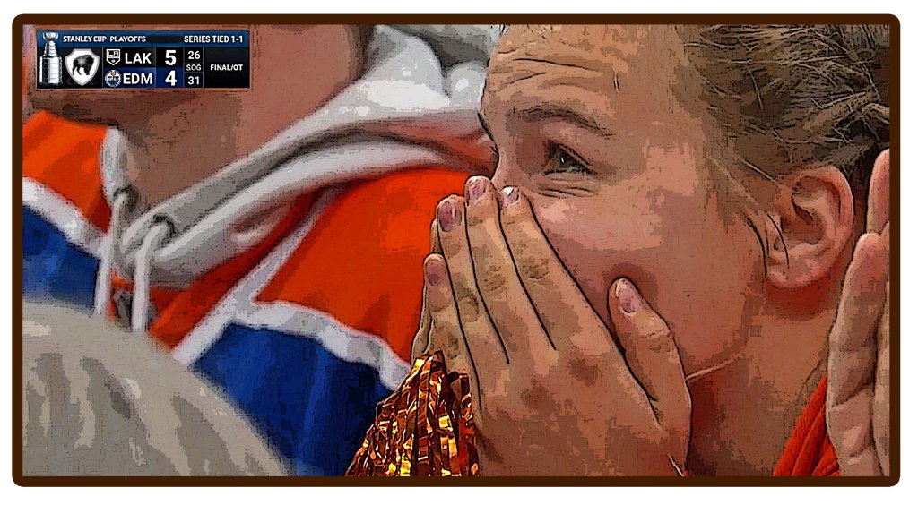 Los Angeles 5 – Edmonton 4 OT (Series tied 1-1) Statistically the Oilers beat the Kings in every category except goaltending as they took 26 SOG over the first two periods to tie the game, then each team scored again in the third before the Kings won on their first shot in overtime.