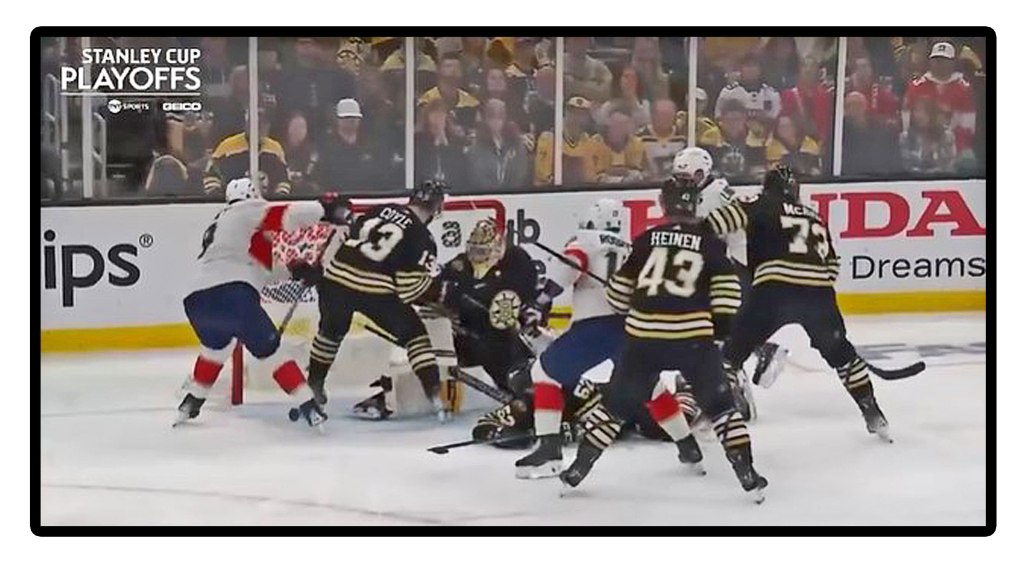 Bruins fans can be sympathized with after watching Florida’s Mr. Bennet cross check a Boston player into their goaltender and then scored the equalizer, and after further review from on ice officials and Toronto HQ…they determined no real goaltender interference.