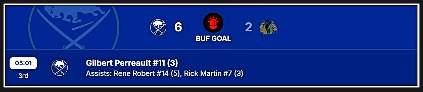 The Blackhawks got one back, but Buffalo answered with two more goals while out shooting Chicago 16 – 5 in the third period, RW Danny Gare (3) and again the French Connection on the powerplay with five minutes remaining built a commanding 6-2 lead and final score.