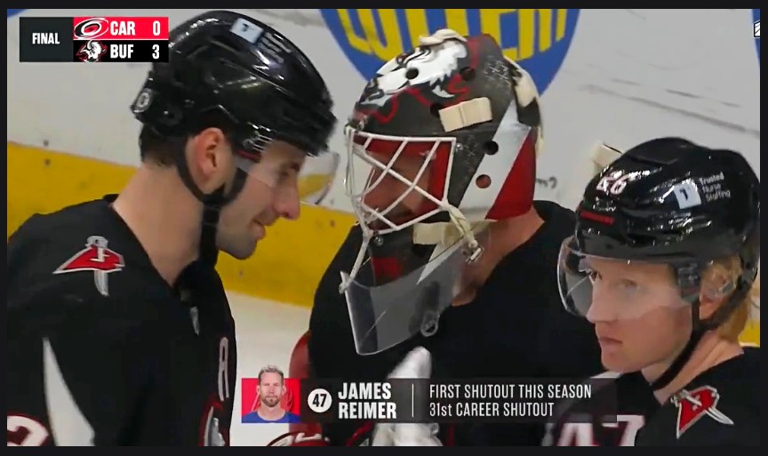 Sabres 3 – Hurricanes 0 Buffalo has won eight of its last nine games, goaltender Reimer recorded his first shutout (31 career shutouts) for the Sabres last night as well as a personal consecutive win (7) streak.