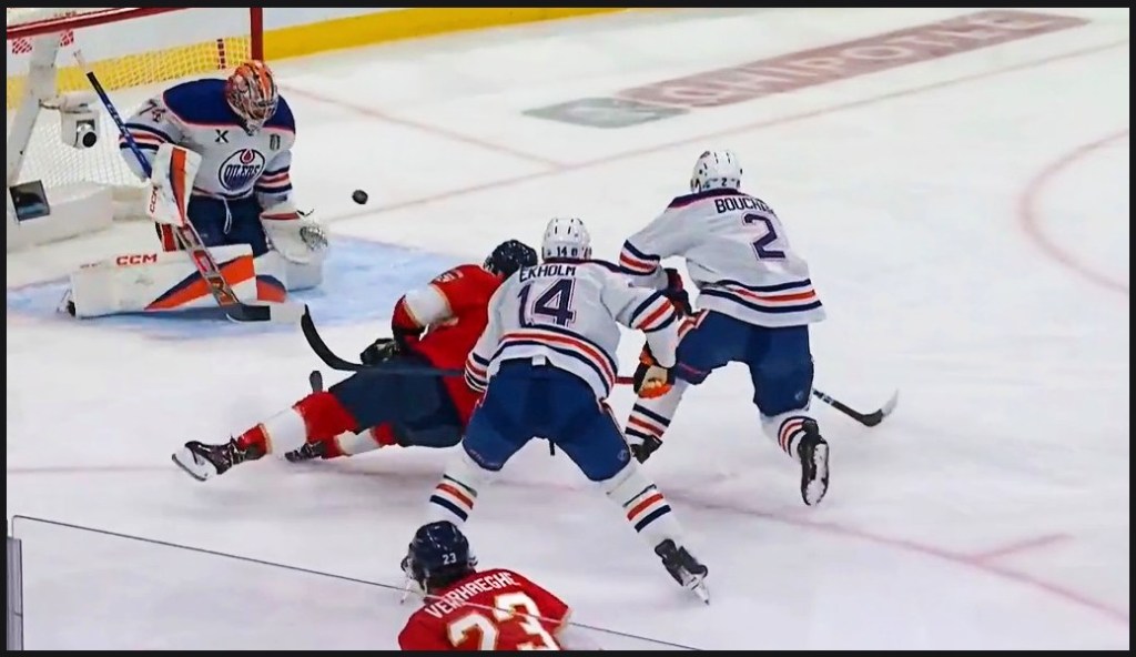 Panthers 5 – Oilers 1 (en x2) (SCF 4-2 Florida) Referees Rooney and Hebert made sure no Edmonton power play would save the day as neither team had the man advantage save one pair of offsetting penalties halfway through the first period, and of course a game misconduct with a couple minutes left in the game.