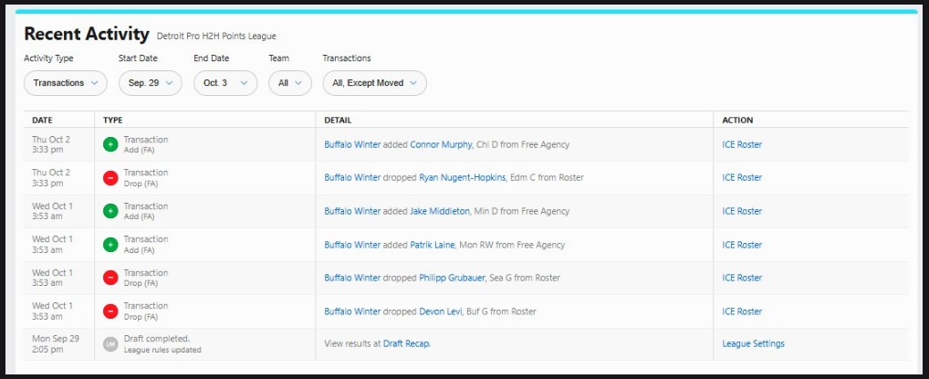 Each ESPN FHL season bears out one concrete fact, the team managers that do not make any waiver wire transactions all season to improve their team ultimately end up one of the bottom four teams in the league.