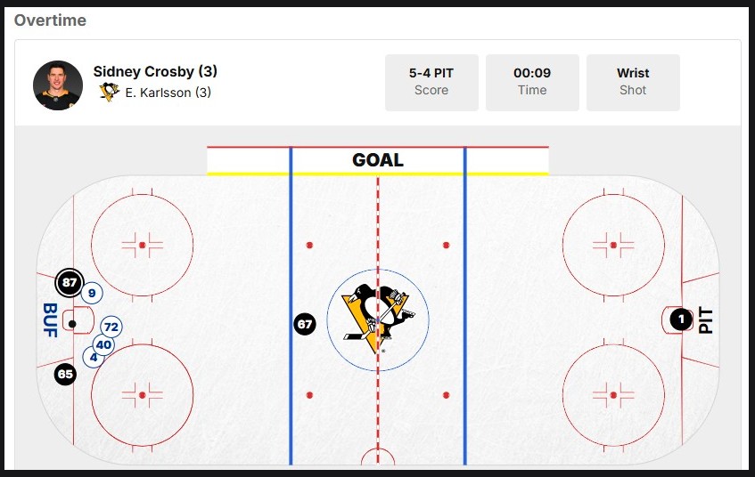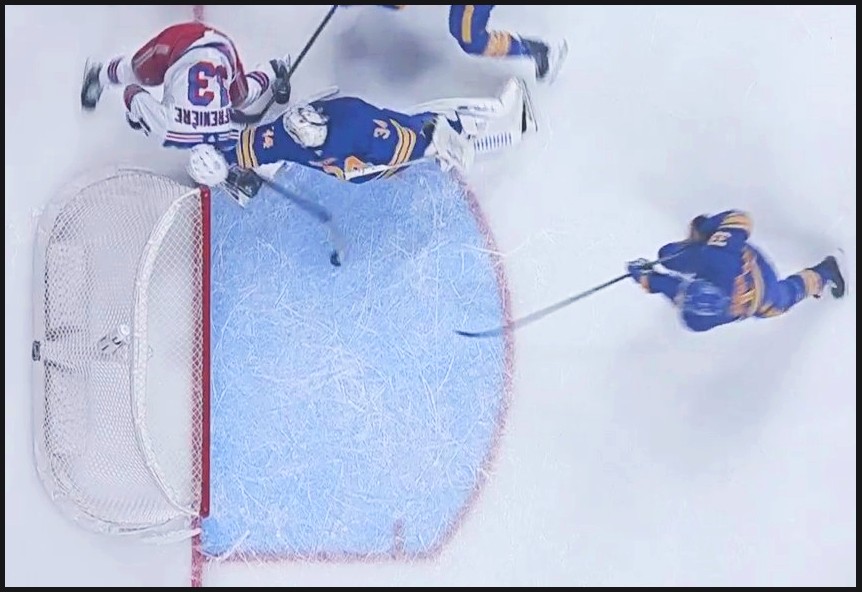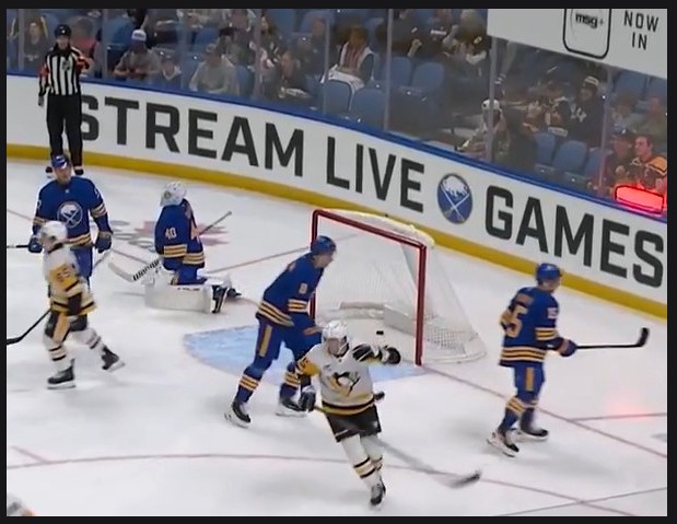 The first goal last night against the Sabres should not have counted, blatant contact initiated by the Pittsburgh player, the announcers also said as much, as the Penguin player leaned into the Sabres defenseman to create contact before colliding with (G) Lyon into the net along with the puck.