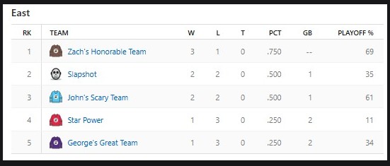 After four weekly matchups there is one undefeated team followed by three 3-1 teams including yours truly, it is too early to predict playoff seedings, yet ESPN FHL does and again I sit with an incredibly low 10% chance of making the playoffs and the winless team has more of a percentage chance to make the playoffs than me.