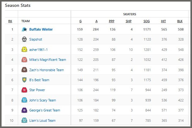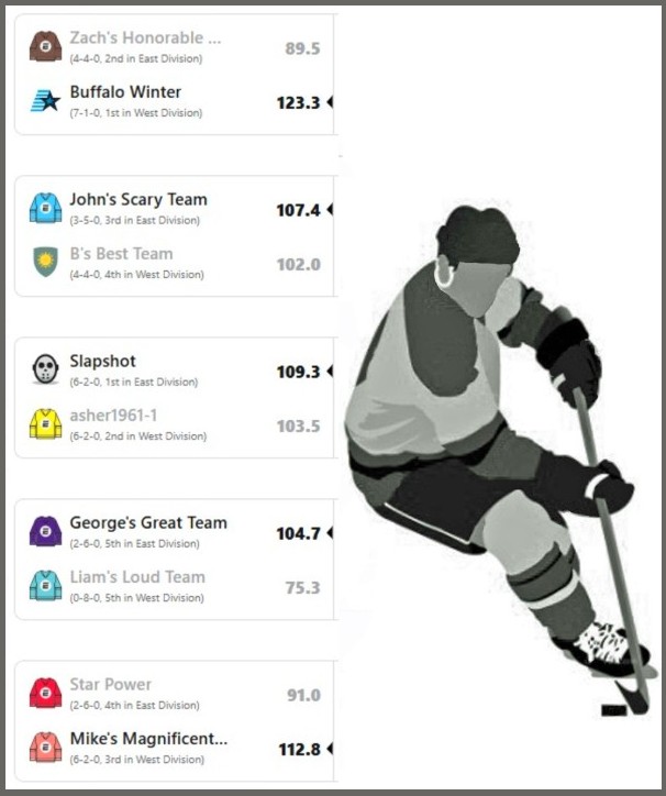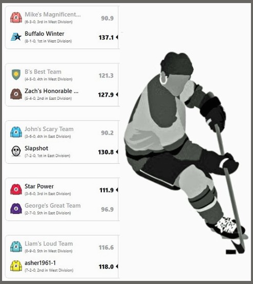 This weekly matchup finds the two division leaders, Slapshot in the East and my Buffalo Winter team from the West, if Slapshot wins then these two teams will share the overall lead.