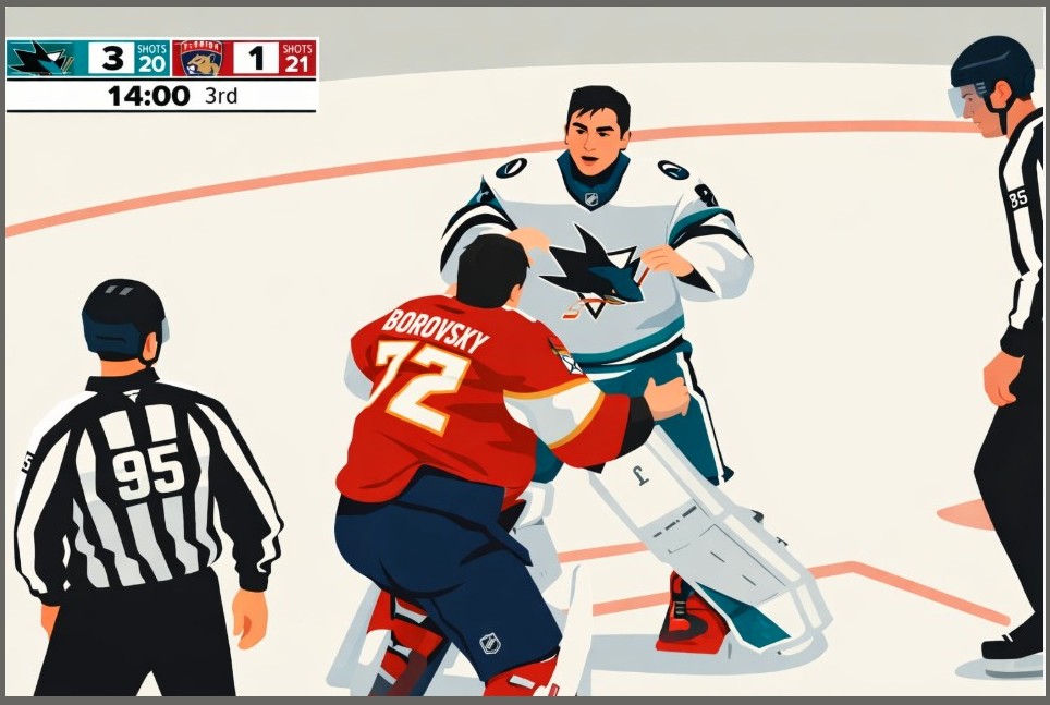 Arguably the Panther’s goaltender was doing what he thought was just after watching the Shark’s goaltender leave his crease and attack one of the Panthers skaters who had taken a cheap shot on a Sharks player low into his back giving the San Jose’s netminder justification to jump in the ensuing scrum to go after the offending Panthers player.