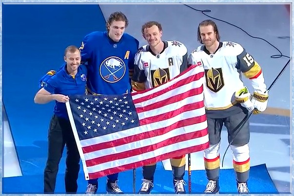 Sabres 3 – Knights 2 Buffalo is now 26-4-1 when scoring the game’s first goal, and Buffalo (LW) Zucker scored his 16th of the year to put the Sabres ahead 1-0 four minutes into the first period, Sabres (D) Power scored just 46 seconds into the second period and five minutes after that Sabres Gold Medalist (C) Thompson scored his 33rd or the season giving Buffalo the 3-0 lead with 14 minutes remaining in the second period when all of a sudden the Knights score twice in approximately two minutes climbing within one goal of Buffalo.