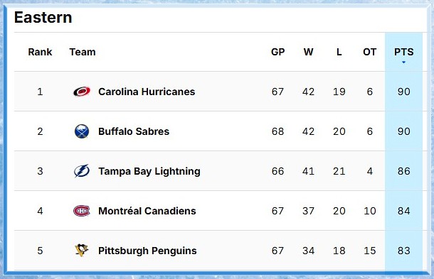 It is also a nice view from atop of the Eastern Conference as the Sabres hit 90 points and have tied the conference leader Carolina, but the Hurricanes have a game in hand which is about the only thing separating these two nearly identical statistically matched teams.