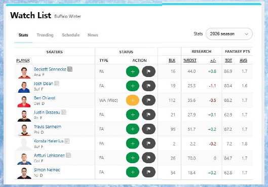 I keep the Buffalo Sabres (RW) Doan and rookie (C) Helenius on my list because I enjoy watching Sabres players doing well, even in an FHL, since I have two Buffalo players on my roster I keep to my strategy by utilizing no more than two players from any one NHL team.