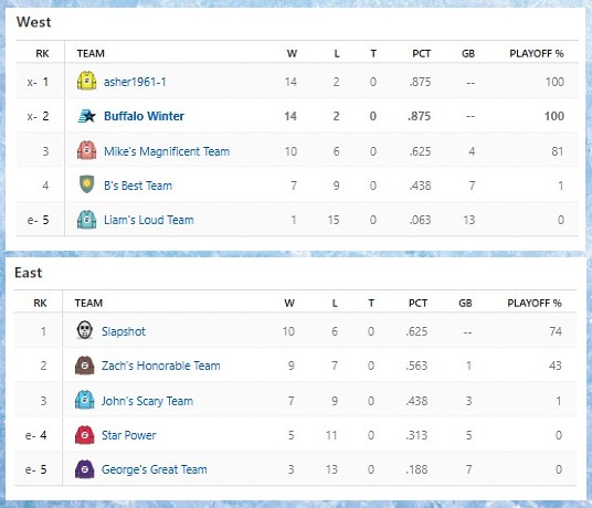 In the next two weekly matchups Buffalo Winter is scheduled to play the top two Eastern Division team managers, Slapshot and Zach’s Honorable Team, before finishing the season playing against three basement teams.