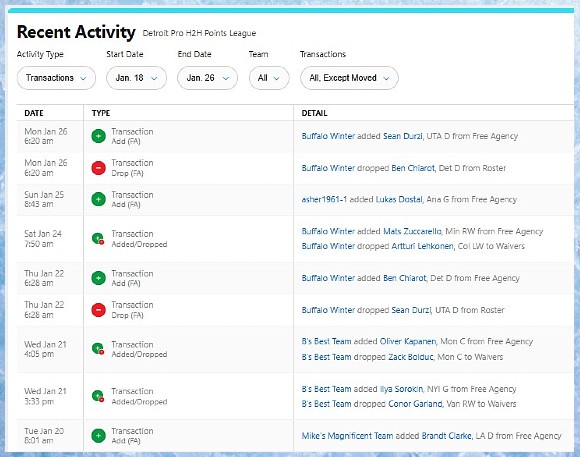 As you can ascertain, I continue to switch in and out of my roster defensemen that are rated at 1.7, although (D) Durzi is now at a 1.8 rating, additionally I dropped my only Colorado player because a stronger forward became available and as much as I appreciate having an Avalanche player on the team, Colorado’s (LW) Lehkonen just is not consistent enough for me to keep him on the roster.