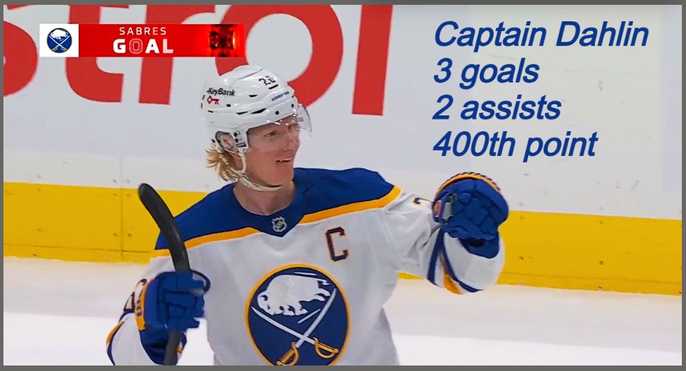 Sabres 7 – Maple Leafs 4 (en) Buffalo Captain (D) Dahlin earned his first NHL hat trick and scored his 400th career point, in leading the Sabres to victory on the road versus a division opponent.