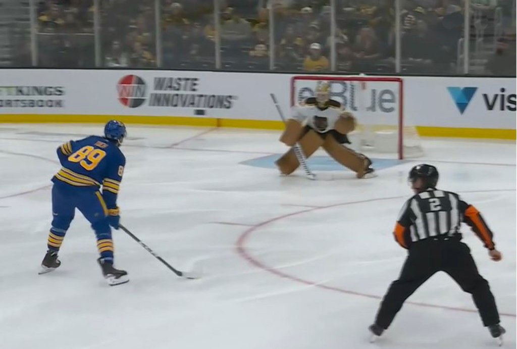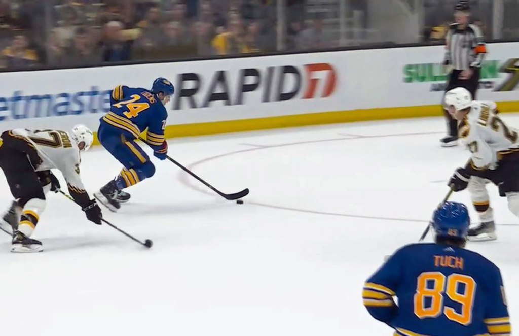 In overtime, Mr. Cozens stripped the puck from Mr. Burgeron, skated from the Buffalo zone deep into Boston territory while double teamed dropped the puck back to Mr. Tuch in the slot who patiently avoided two defenders before snapping a greasy wrister with 67 seconds remaining for the win.