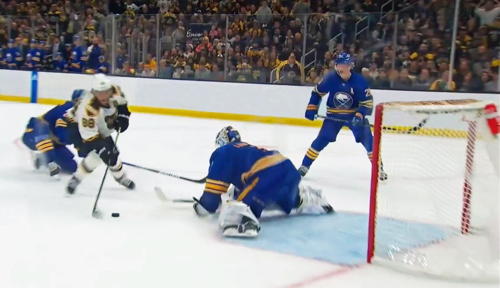 Buffalo’s penalty killers along with Mr. Luukkonen making a game-saving pad save on Mr. Pasta himself killed off the penalties, Buffalo proceeds to pull the goalie, and with 1:45 remaining in the game, Mr. Dahlin makes a block/save on Mr. Pastrnak’s shot at the empty net.